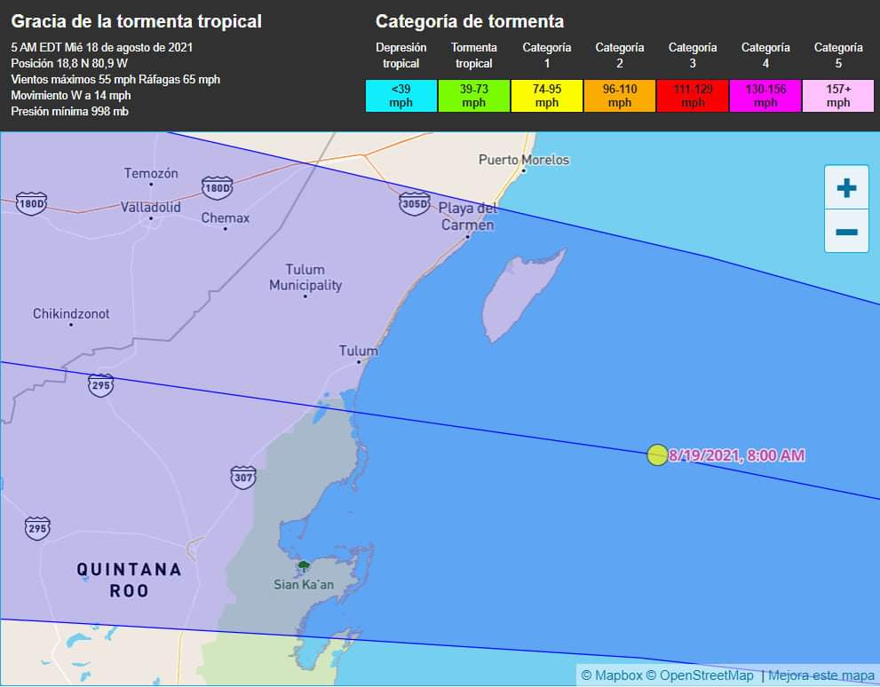 Chetumal, Quintana Roo, miércoles 18 de agosto del 2021, poderycritica.- La COEPROC informa que el centro de la aún tormenta tropical Grace se ubicaba hoy a las 4:00 horas aproximadamente a 710 kilómetros al este sureste de Tulum y a 675 kilómetros al este sureste de Cancún, Quintana Roo, presenta vientos máximos sostenidos de 100 km/h, rachas de hasta 120 km/h y desplazamiento hacia el Oeste a 26 km/h.