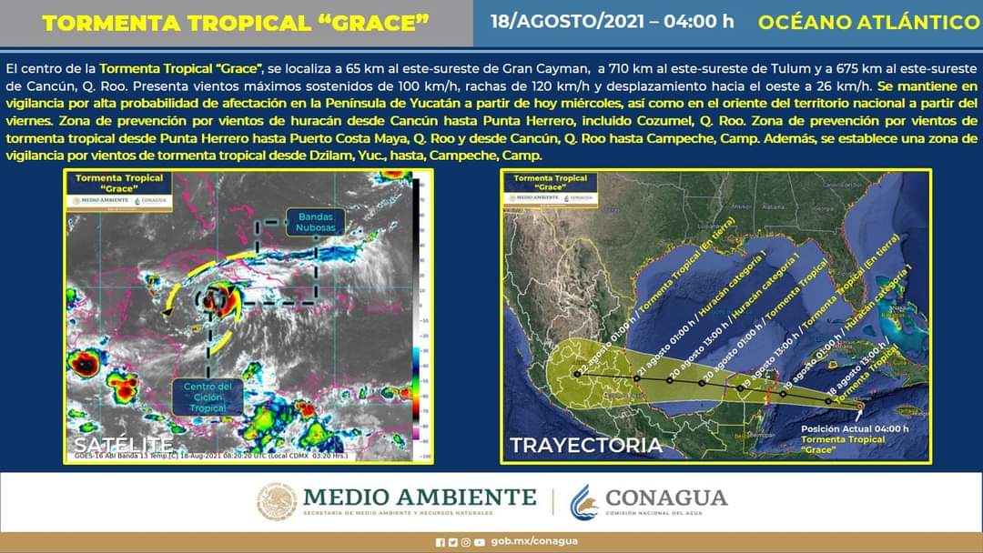 Chetumal, Quintana Roo, miércoles 18 de agosto del 2021, poderycritica.- La COEPROC informa que el centro de la aún tormenta tropical Grace se ubicaba hoy a las 4:00 horas aproximadamente a 710 kilómetros al este sureste de Tulum y a 675 kilómetros al este sureste de Cancún, Quintana Roo, presenta vientos máximos sostenidos de 100 km/h, rachas de hasta 120 km/h y desplazamiento hacia el Oeste a 26 km/h.