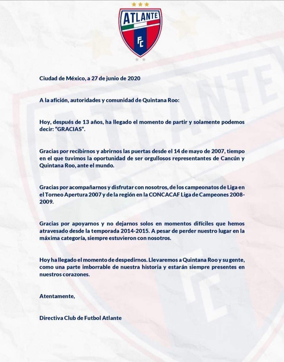 «Gracias por recibirnos y abrirnos las puertas desde el 14 de mayo de 2007, tiempo en el que tuvimos la oportunidad de ser orgulloso representantes de Cancún, Quintana Roo ante el mundo», precisa el club.