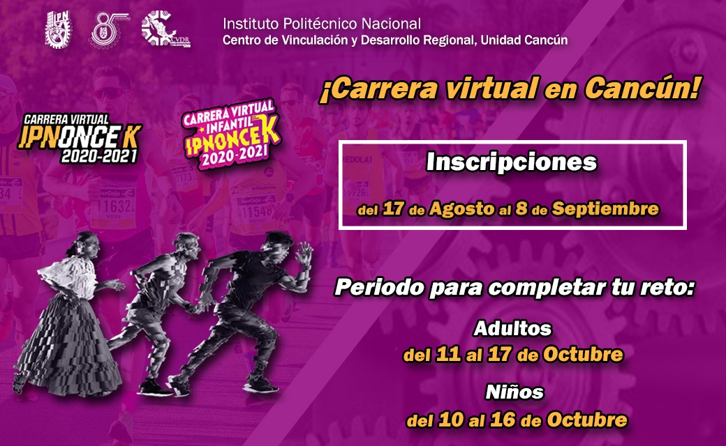 Cancún, Q. Roo, Lunes 30 de Agosto de 2021, poderycrítica.- Después de un año de ausencia ocasionado por la pandemia del Covid-19, el Instituto Politécnico Nacional (IPN), decide retomar su tradicional carrera deportiva ahora de manera virtual, la cual se llevará a cabo de forma simultánea en diversas partes del país el 17 de octubre.