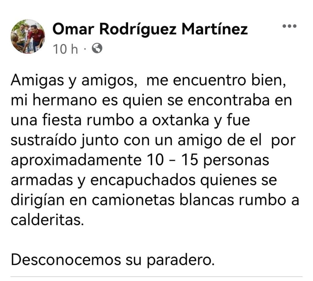 “Amigas y amigos, me encuentro bien, mi hermano es quien se encontraba en una fiesta rumbo a oxtanka y fue sustraído junto con un amigo de el por aproximadamente 10 – 15 personas armadas y encapuchados quienes se dirigían en camionetas blancas rumbo a Calderitas. Desconocemos su paradero”, señaló en su mensaje.