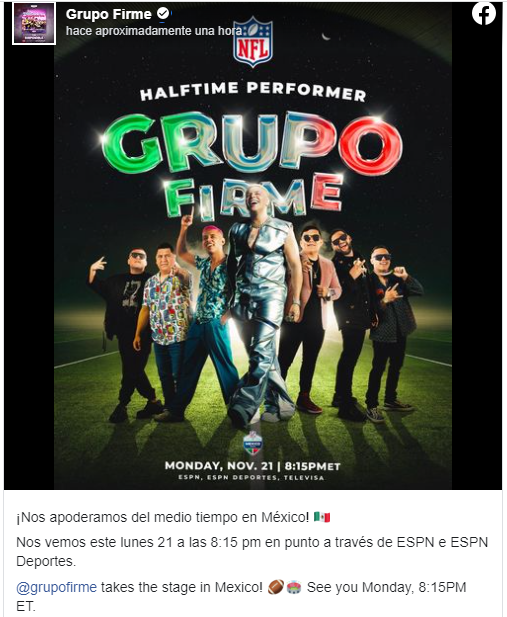 Grupo Firme participará en el show de medio tiempo de la NFL en México