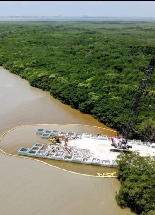 En junio abrieron una brecha, talando el manglar de aproximadamente 300 m” justo al costado de Tajamar, afectando mangle rojo (Rhizophora mangle) y de mangle blanco (Laguncularia racemosa)  ambas especies enlistadas en el Anexo Normativo III, cabe mencionar que en  la MIA, cuya autorización es ilegal, no se autoriza ningún trabajo de desmonte y relleno sobre humedal costero , debido a que usarían  el “Top Down”   sistema de construcción de pilotes, sin que ello implique remoción o relleno total de la superficie como se aprecia en las imagines de satélite anexas.