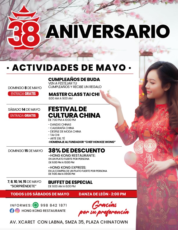 • Todos los sábados de mayo. Danza del león en el Restaurante Hong Kong Cancún a las 2:00 pm.