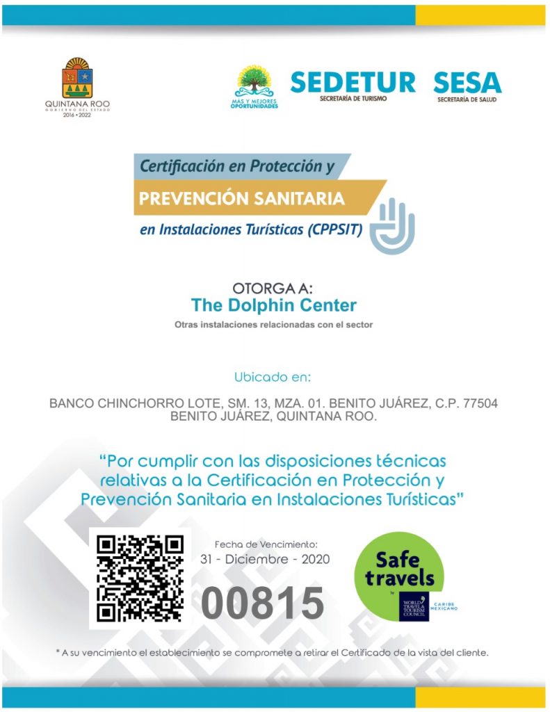 La Certificación en Protección y Prevención Sanitaria en Instalaciones Turísticas (CPPSIT) fue otorgada por la Secretaría de Turismo del Estado de Quintana Roo (SEDETUR). Las oficinas corporativas de la empresa, sus hábitats de delfines en Isla Mujeres y Puerto Aventuras, así como Parque Garrafón fueron acreditados. Para la obtención de la CPPSIT fue necesario que The Dolphin Company realizará un procedimiento que concluyó en la evaluación de áreas de servicio y operación como recepción, alimentos y bebidas, áreas de alberca, capacitación y sensibilización, así como equipo de protección, entre otras; la cual fue efectuada por un Comité Técnico integrado por autoridades en turismo y salud. De esta forma, se garantiza a los huéspedes, colaboradores y especies que habitan bajo el cuidado de la empresa, la implementación de buenas prácticas en materia de protección y seguridad sanitaria. Dentro de las siguientes semanas, más hábitats y parques serán certificados.
