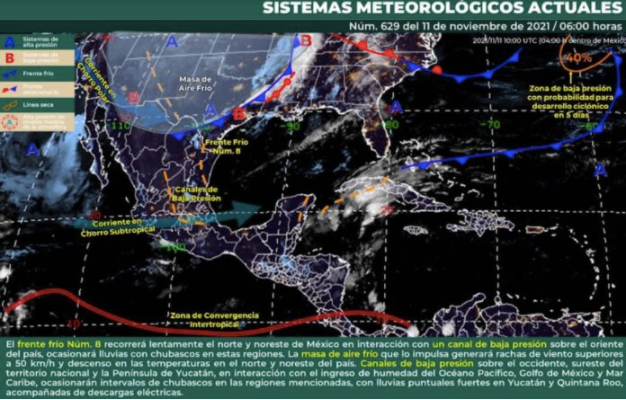 Por otro lado, el frente frío Núm. 8 recorrerá lentamente el norte y noreste de México en interacción con un canal de baja presión sobre el oriente del país, ocasionará lluvias con chubascos en estas regiones. La masa de aire frío que lo impulsa generará rachas de viento superiores a 50 km/h y descenso en las temperaturas en el norte y noreste del país. También los canales de baja presión sobre el occidente, sureste del territorio nacional y la Península de Yucatán, en interacción con el ingreso de humedad del Océano Pacífico, Golfo de México y Mar Caribe, ocasionarán intervalos de chubascos en las regiones mencionadas, con lluvias puntuales fuertes en Yucatán y Quintana Roo, acompañadas de descargas eléctricas