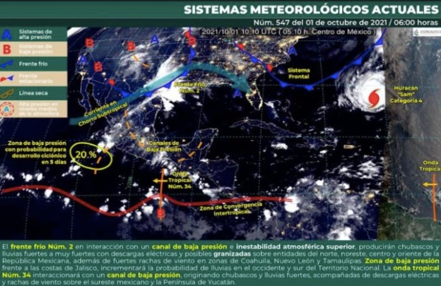 Adicionalmente, la onda tropical Núm. 34 recorrerá el sureste mexicano e interaccionará con un canal de baja presión sobre la Península de Yucatán, originando chubascos y lluvias fuertes, descargas eléctricas y rachas de viento en las regiones mencionadas.