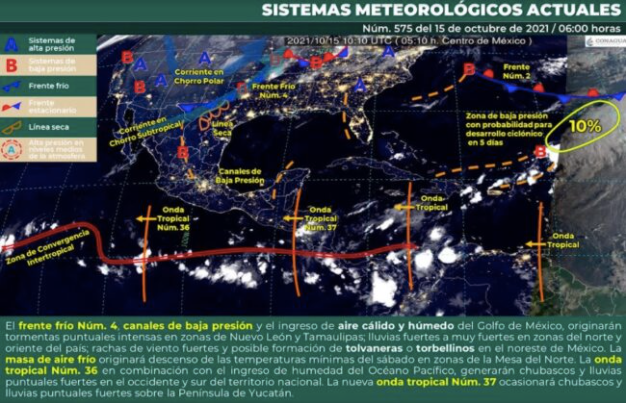 La onda tropical No 37 se localiza en superficie y se ubica en la porción oriental del estado de Quintana Roo, en su amplia circulación periférica impulsa aire marítimo tropical procedente del mar Caribe con variado contenido de humedad hacia la península de Yucatán; generando, poca nubosidad variable, con probabilidades de lluvia ocasionales aisladas, así como, algunos chubascos ocasionales aislados, temperaturas calurosas a muy calurosas, viento fresco y arrachado del este variando al sureste, sobre la península de Yucatán y zona costera, centro y norte de estado de Quintana Roo durante el día.