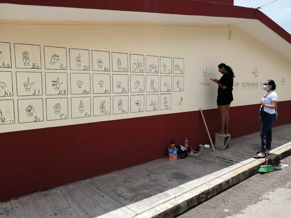 Chetumal, Q. Roo, jueves 09 de septiembre de 2021, poderycrítica.- La artista Damaris Alejandra Moo Zamora pintó pictogramas con lenguaje de señas mexicano en una de las paredes del kínder José María Morelos, de Kantunilkín, para fomentar la inclusión.
