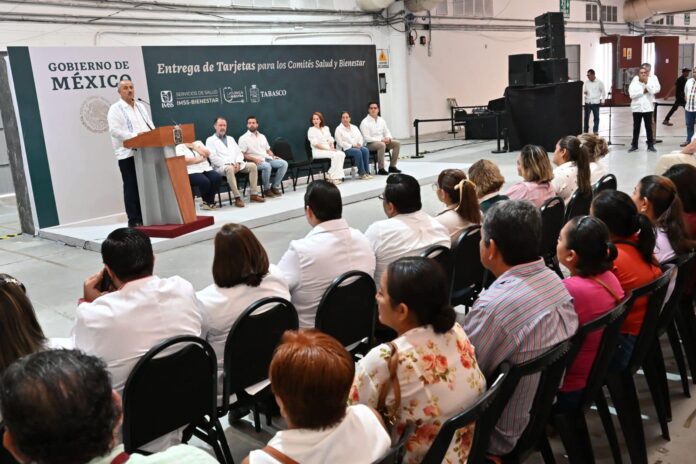 Acompañado del delegado estatal de Programas para el Bienestar, Arturo Enrique Priego Rodríguez, y el coordinador estatal del Programa IMSS-Bienestar, Manuel Adalberto Pérez Lanz, Carlos Merino distribuyó las tarjetas correspondientes entre tesoreras de 87 Comités de Salud para el Bienestar (Cosabi).