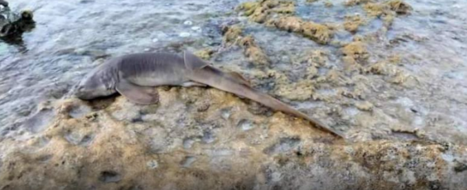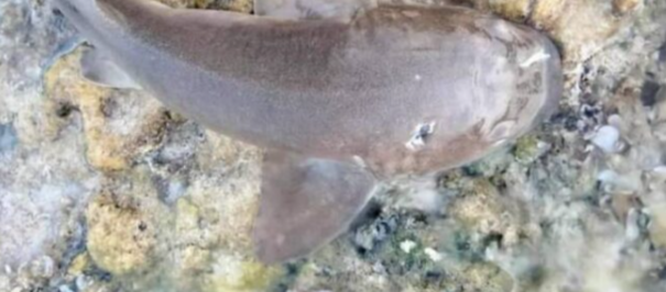 Cozumel, Quintana Roo, lunes 12 de julio del 2021, poderycritica.- El cuerpo de un tiburón gato capturado con un arpón fue fue hallado esta mañana a orillas de la playa, cerca de un restaurante bar en la zona hotelera sur.