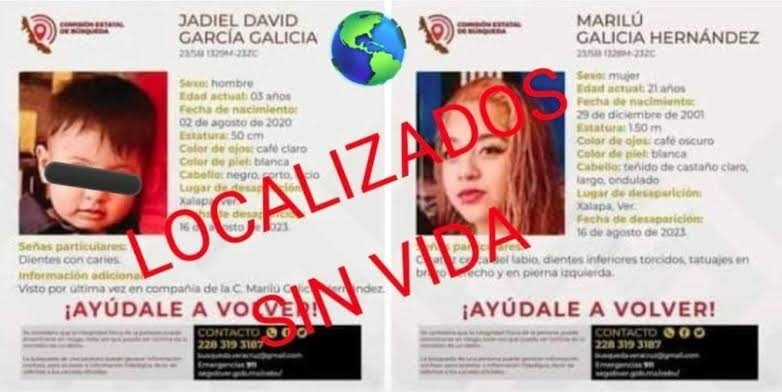 Entre los cuerpos localizados se encuentran el de Marilú Galicia Hernández, de 21 años de edad, y su hijo Jadiel David García Galicia, de 3 años de edad, quienes fueron reportados como desaparecidos desde el 16 de agosto.