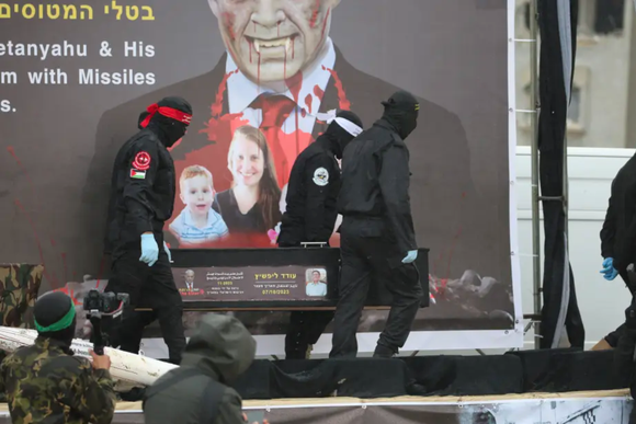 En la Franja de Gaza, milicianos de Hamás exhibieron cuatro ataúdes negros en un escenario rodeado de pancartas, incluida una con la imagen del primer ministro israelí, Benjamin Netanyahu, representado como un vampiro.