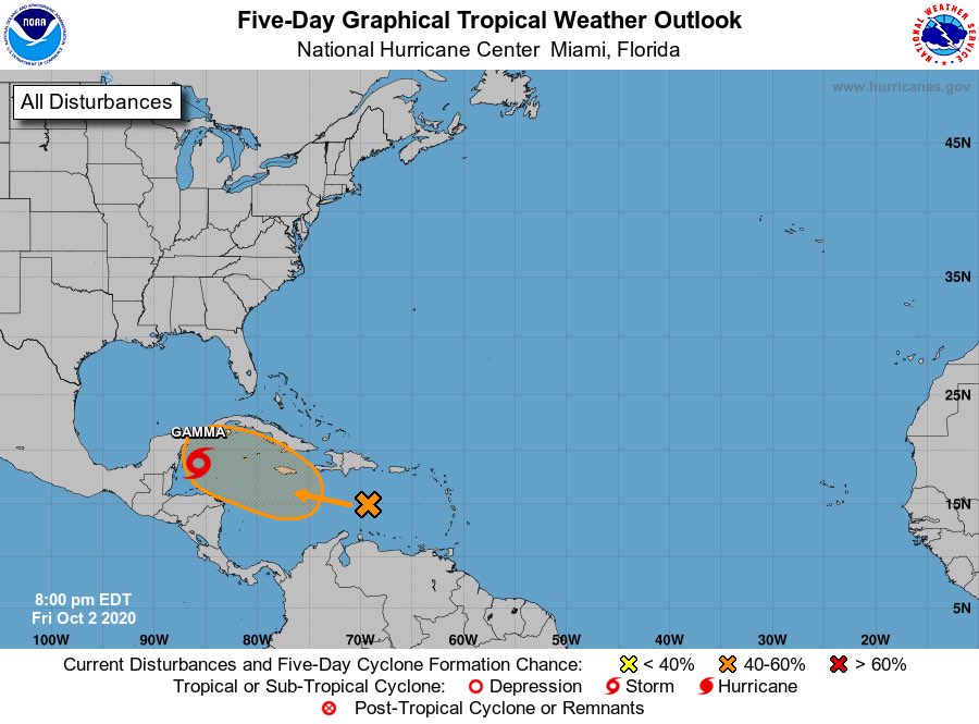 Cancún, Q. Roo, Domingo 04 de Octubre del 2020, poderycrítica.- El Centro Nacional de Huracanes (NHC) de EU, mantiene vigilancia en una zona de baja presión asociada con una onda tropical sobre el Mar Caribe la cual ha aumentado a 70% su probabilidad de desarrollo ciclónico en las próximas 48 horas. De desarrollarse a tormenta llevaría el nombre ‘Delta’.