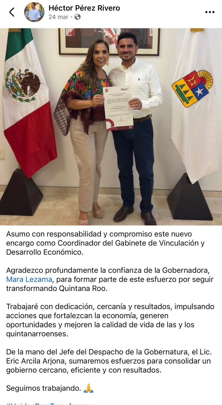 PODER Y CRÍTICA | REDACCIÓN | MORENA sigue recolectando y sumando la escoria de la política local, de caminar de manera ‘independiente’ como la opción civil para el municipio de Othón P. Blanco, Héctor Pérez Rivero, fue exhibido con un vocabulario soez y vulgar reclamándole a un comunicador que lo ha exhibido como Regidor corrupto y solapador de Yensunni Martínez Hernández; ese es el nuevo Coordinador del Gabinete de Vinculación y Desarrollo Económico dentro del Despacho de la Gobernadora que regentea el no menos corrupto de Eric Arcila, quien ya tiene un nuevo colaborador para seguir operando «moches» en esa oficina Ejecutiva.
