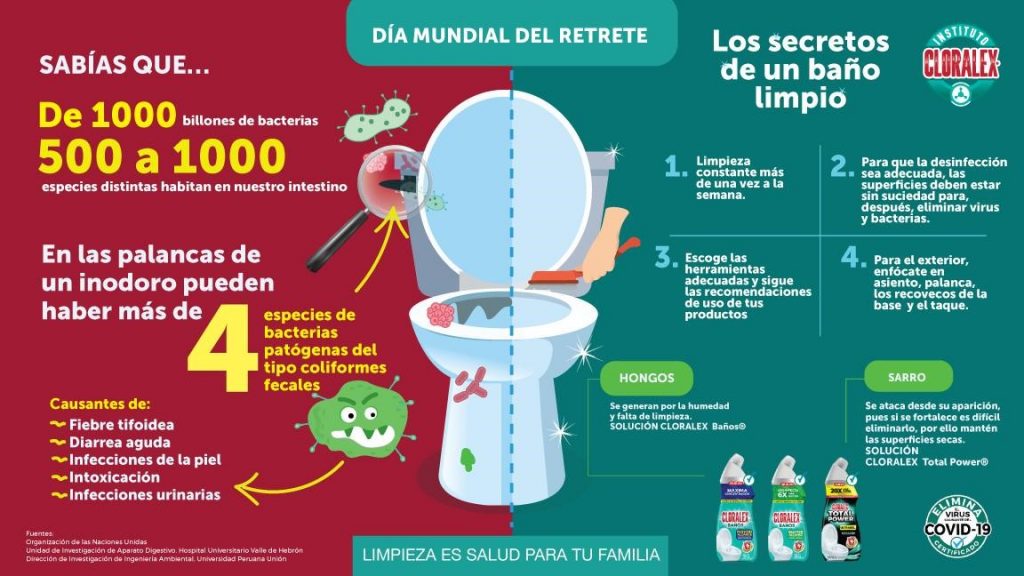 Así como diario nos lavamos los dientes, diario debemos lavar el baño pues constantemente entramos en contacto con secreciones como heces, orina y otros fluidos; al usarlo cada día, la suciedad y los olores pueden llegar a concentrar más de 100 billones de bacterias de 500 a 1.000 especies distintas que habitan en nuestro intestino.