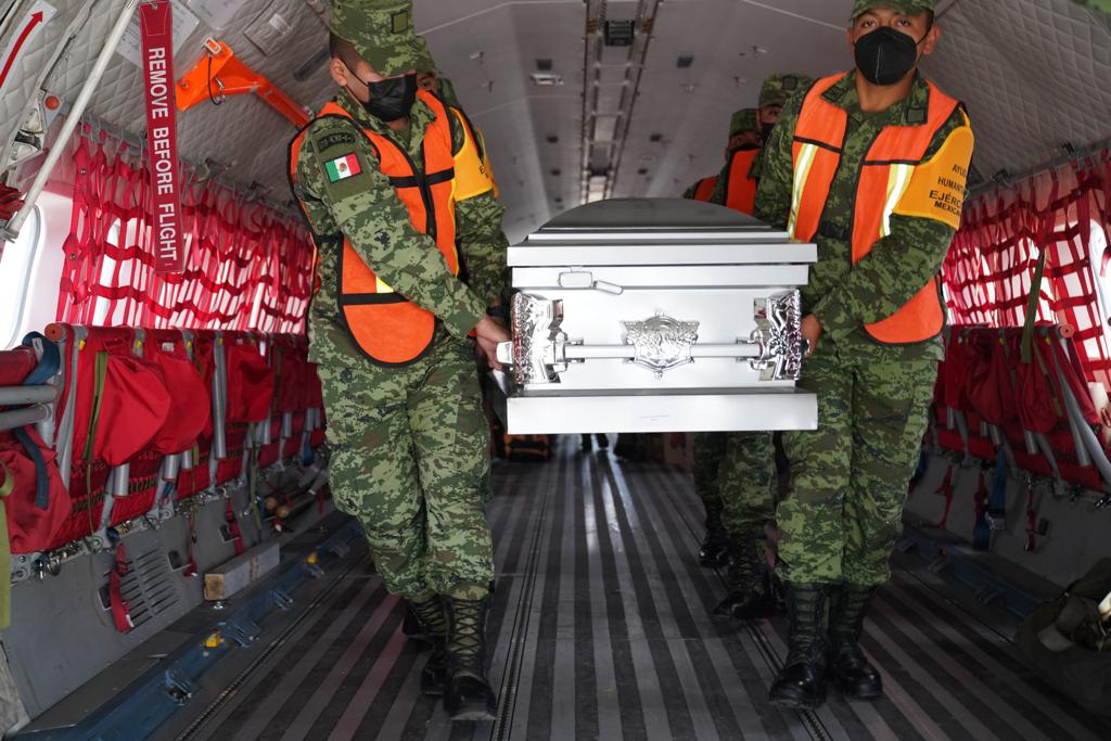 Funcionarios de la Secretaría de Gobernación, a través del Instituto Nacional de Migración (INM), y de las secretarías de Relaciones Exteriores (SRE) y de la Defensa Nacional (Sedena), recibieron los ataúdes de Miriam ‘R’ y Álvaro ‘O’, los cuales están en traslado a La Trinitaria, Chiapas, y Cortazar, Guanajuato, respectivamente, para que sean recibidos por sus familiares.