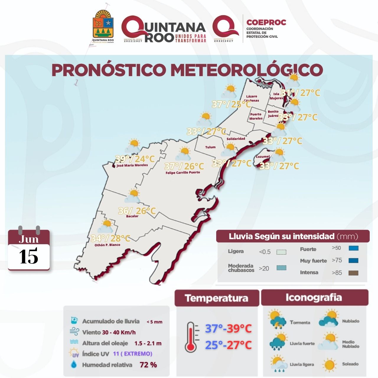 PODER Y CRÍTICA | REDACCIÓN | La Coordinación Estatal de Protección Civil (Coeproc) dio a conocer todos los detalles del clima en Cancún y Quintana Roo para este jueves 15 de junio, por lo que si quieres evitar imprevistos por el mal tiempo, te sugerimos revisar el pronóstico para hoy.