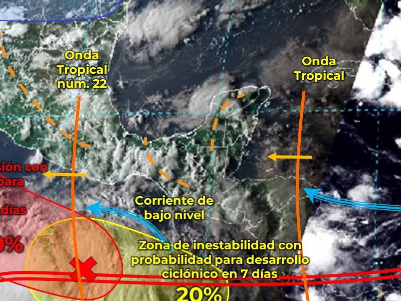 El posible ciclón tropical originado a partir de la zona de baja presión con potencial para desarrollo ciclónico al sur de las costas de Guerrero, asociada con la onda tropical Núm. 22, mantendrá el potencial para lluvias puntuales intensas en Oaxaca, Guerrero y Michoacán.