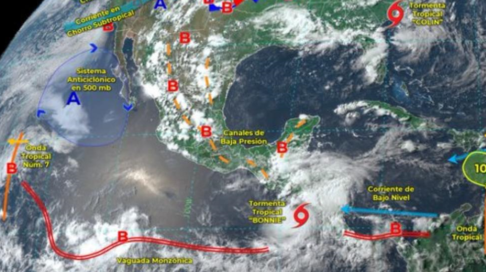 PODER Y CRÍTICA | REDACCIÓN | El ciclón tropical “Bonnie” se aproximará al Golfo de Tehuantepec y en interacción con un canal de baja presión ubicado sobre el suroeste del Golfo de México, ocasionará lluvias fuertes a muy fuertes acompañadas de descargas eléctricas en el sureste del territorio nacional, incluida la Península de Yucatán, con lluvias puntuales intensas