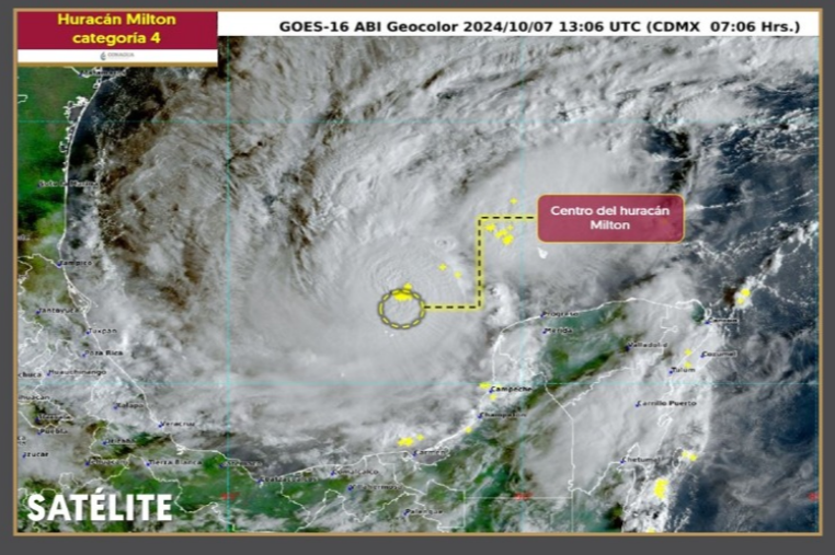 Hasta las 7 de la mañana, el ojo del huracán Milton se encuentra aproximadamente a 215 km al oeste-noroeste de Celestún, Yucatán, y a 265 km al oeste-noroeste de Progreso, Yucatán, moviéndose hacia el este-sureste a una velocidad de 13 km/h.