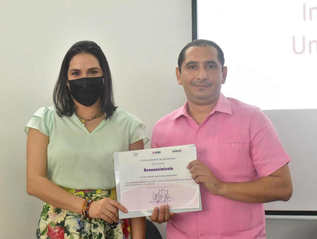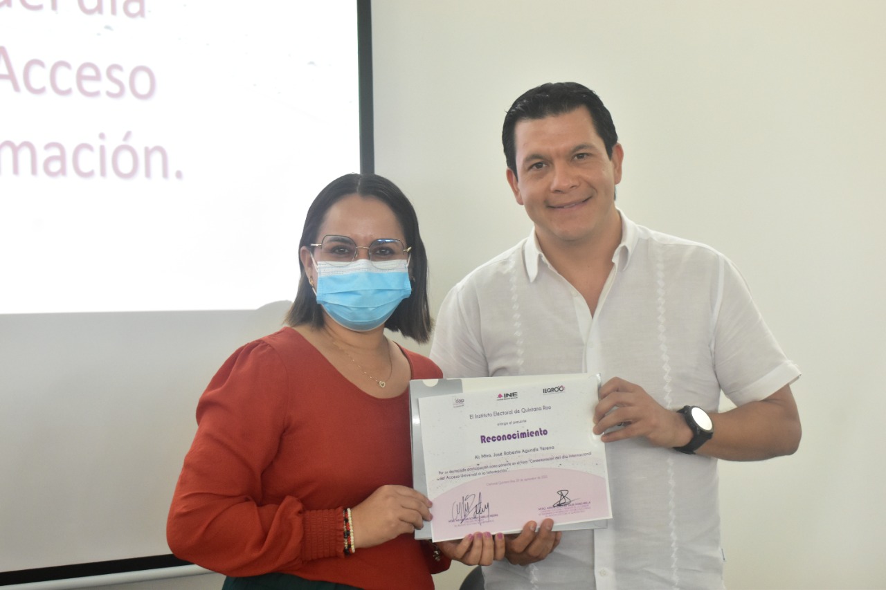 En cuanto al cumplimiento de obligaciones en esta materia, comentó que el IEQROO recibió del Instituto de Acceso a la Información y Protección de Datos Personales de Quintana Roo un reconocimiento por buenas prácticas de transparencia por haber obtenido el índice global de cumplimiento del ejercicio 2021 con la publicación de su información en su portal de transparencia con el 100 por ciento.