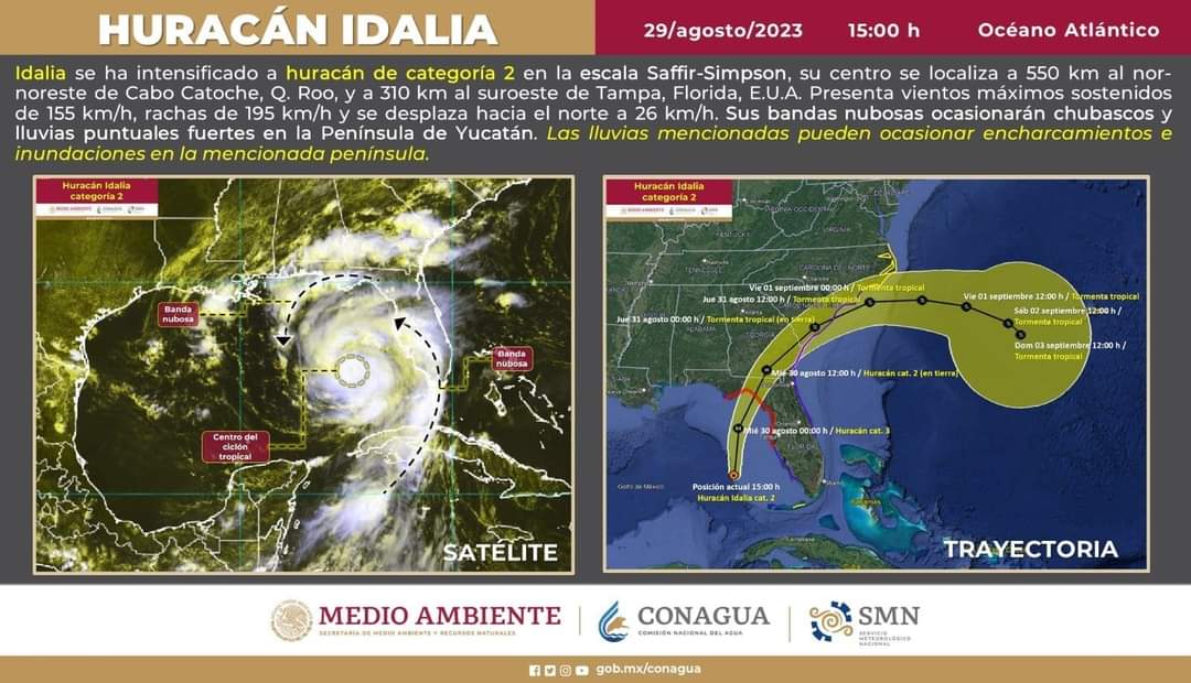 PODER Y CRÍTICA | REDACCIÓN | Idalia se ha intensificado a huracán de categoría 2 en la escala Saffir-Simpson, su centro se localiza a 550 km al nor- noreste de Cabo Catoche, Q. Roo, y a 310 km al suroeste de Tampa, Florida, E.U.A. Presenta vientos máximos sostenidos de 155 km/h, rachas de 195 km/h y se desplaza hacia el norte a 26 km/h.
