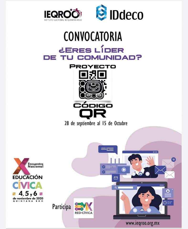 Chetumal, Q. Roo, Miércoles 14 de Octubre del 2020, poderycrítica.- ¿Eres un líder en tu comunidad? El Instituto Electoral de Quintana Roo (IEQROO) y el Instituto para el Desarrollo y la Competitividad S. C. (IDDECO) invitan a personas jóvenes de 18 a 29 años a participar en el Programa Proyecto Código QR, tienes hasta el día 15 de octubre para registrar y presentar tus propuestas de solución a los asuntos públicos de tu comunidad, municipio y/o entidad. La presentación de los trabajos se realizará durante los días 4, 5, y 6 de noviembre en el marco del X Encuentro Nacional de Educación Cívica (ENEC) que se realizará en Quintana Roo.