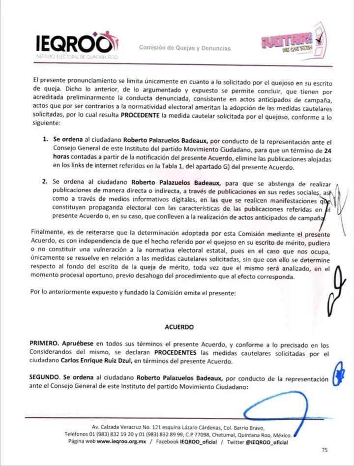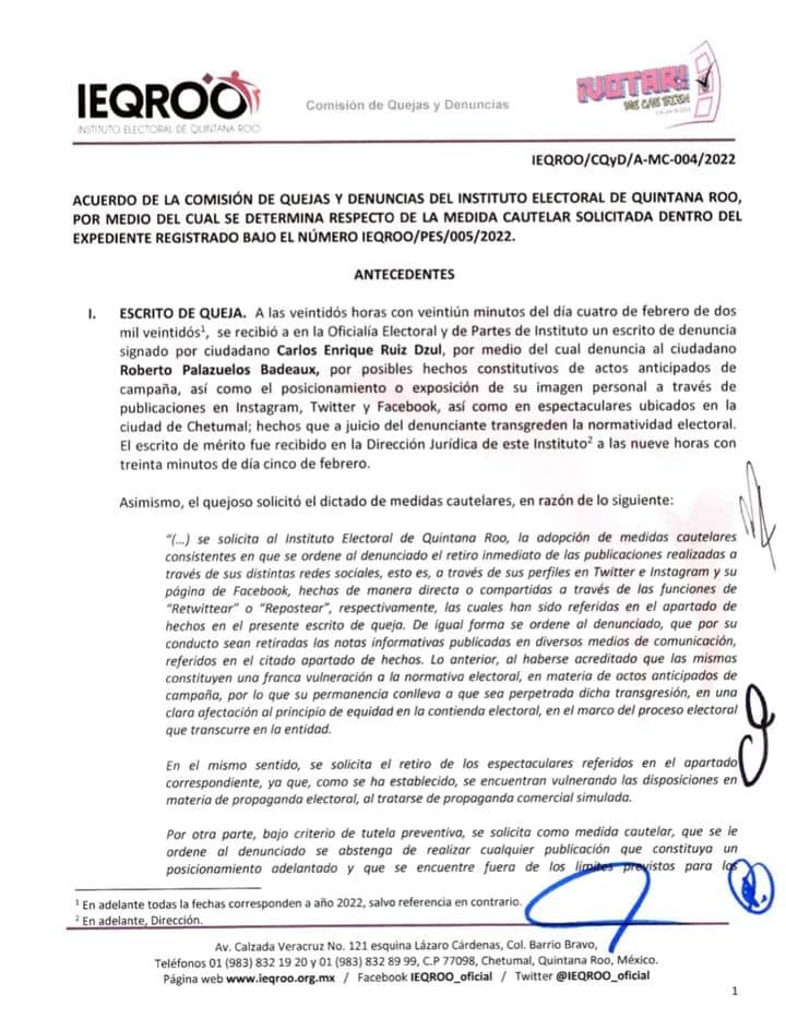 La resolución del Instituto Electoral de Quintana Roo es una respuesta a una denuncia interpuesta ante ese órgano electoral, el pasado 4 de febrero por el ciudadano Carlos Enrique Ruiz Dzul, quien acusa a Roberto Palazuelos Badeaux de actos anticipados de campaña.
