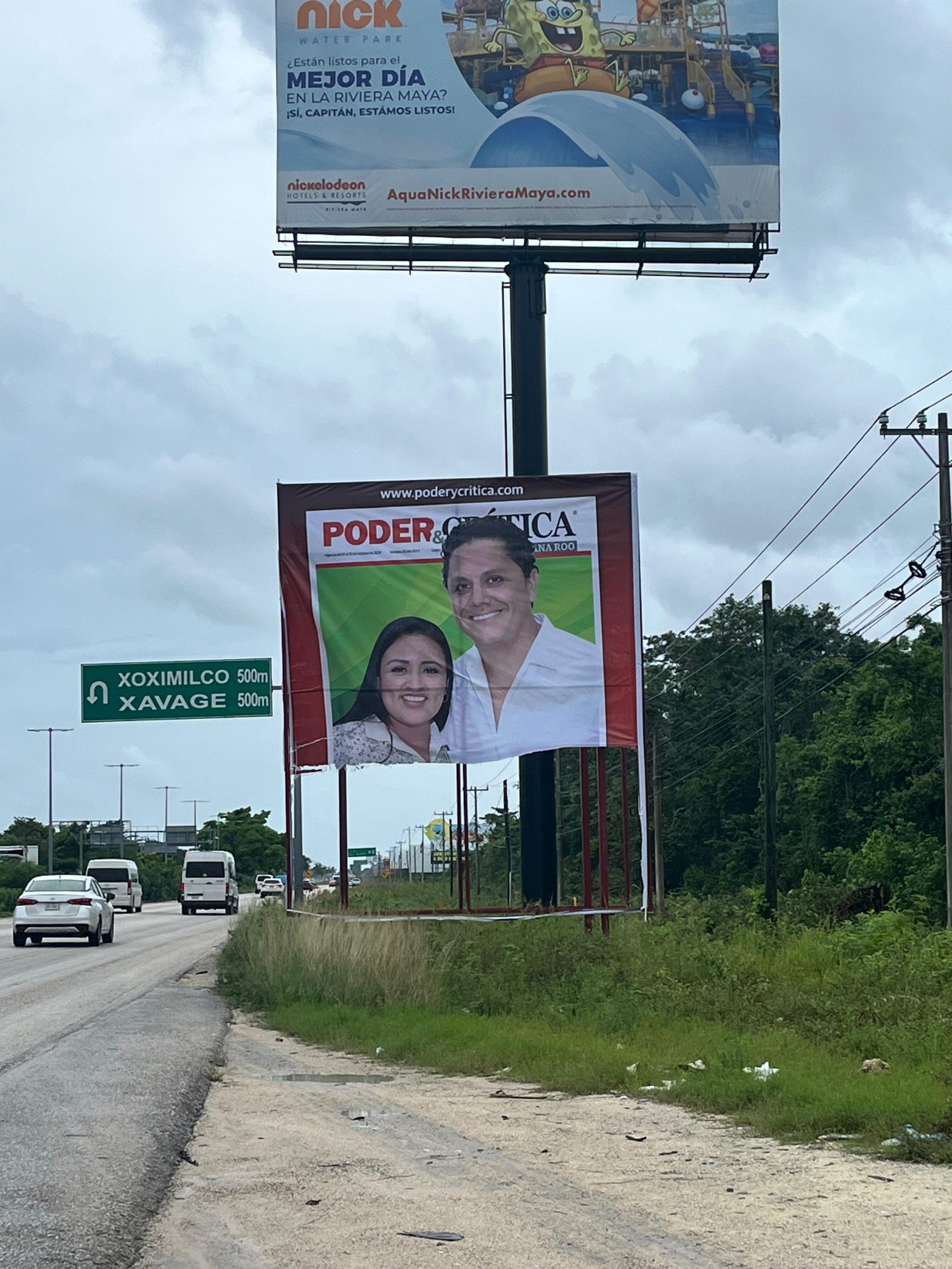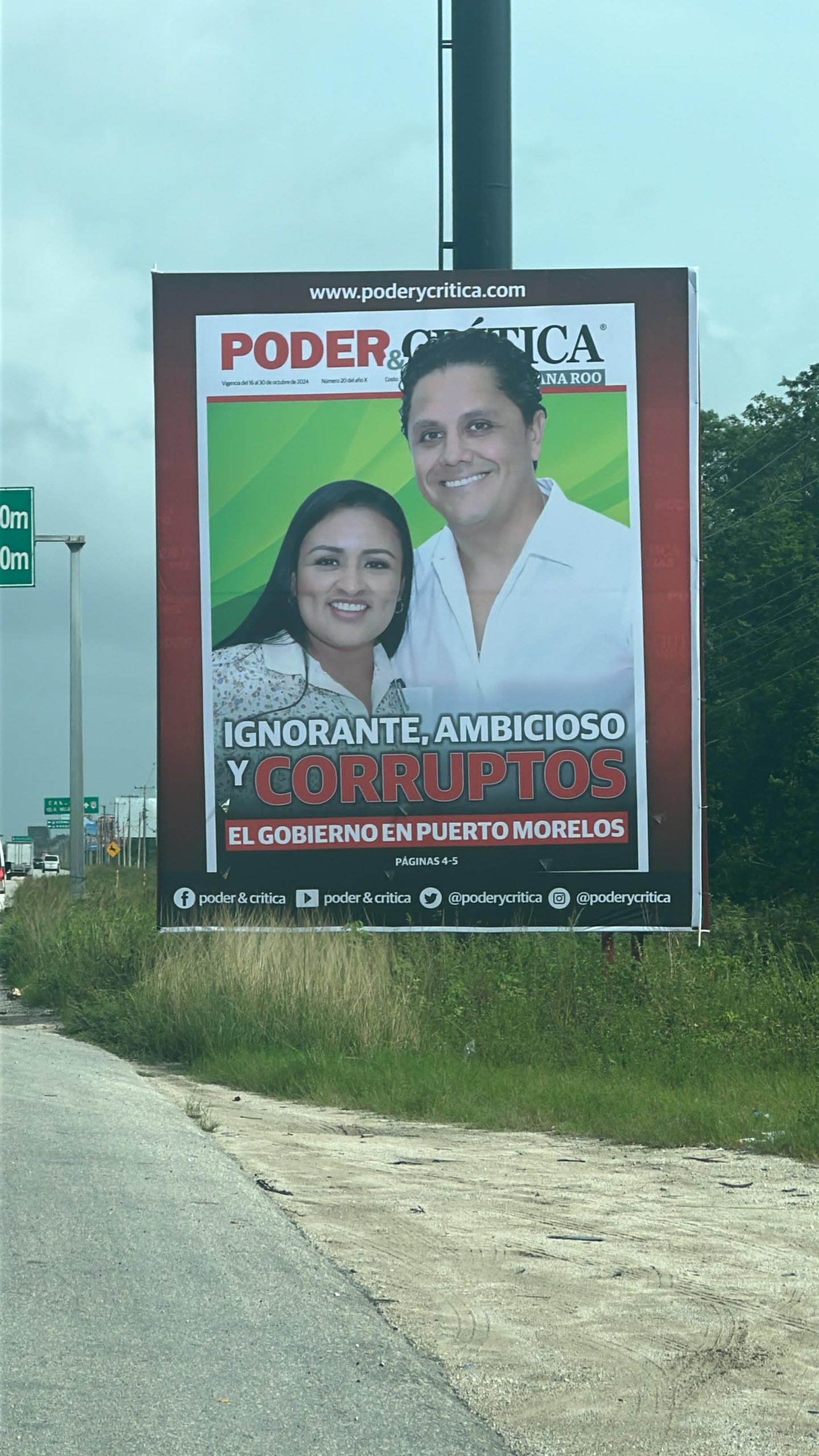 El espectacular con la más reciente portada de Poder y Crítica se ubica en la carretera federal 307 bajando el puente que se ubica en la entra al hotel del Moon Palace, vía puerto Morelos-Cancún.