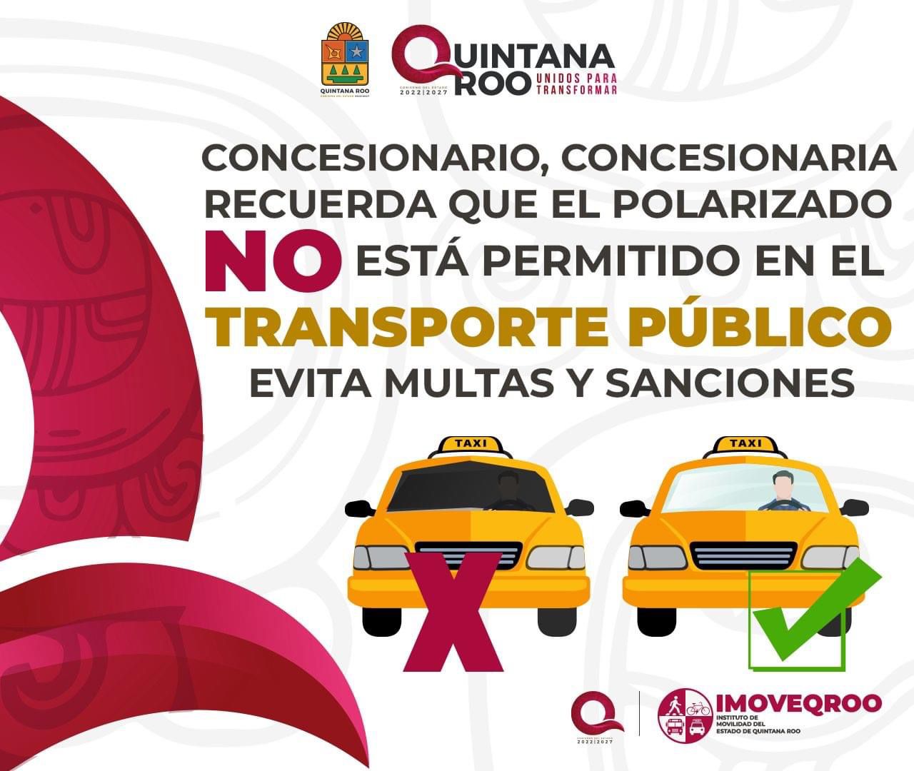PODER Y CRÍTICA | REDACCIÓN | Con la finalidad de garantizar la seguridad de las y los usuarios del sistema de transporte público, el Instituto de Movilidad del Estado de Quintana Roo (IMOVEQROO) lanza campaña para el retiro de polarizados en las unidades de transporte público de concesión estatal, tanto taxis como colectivos.