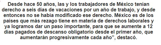 El secretario de la Mesa Directiva del Senado destacó que la extensión de las vacaciones pagadas, que aumentarán anualmente hasta alcanzar 32 días por 35 años de servicio, significa un avance enorme sobre los derechos laborales en nuestro país.