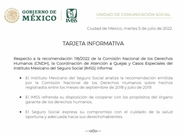 Tras la recomendación, el IMSS respondió que “El Seguro Social expresa su compromiso con el cuidado de la salud oportuna y adecuada hacia sus derechohabientes” y dijo que analiza la recomendación de la Comisión Nacional de los Derechos Humanos.