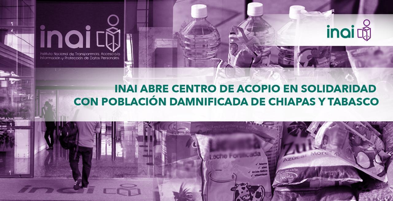 A partir del lunes 9 de noviembre, el INAI abrirá en sus instalaciones un centro de acopio, con el propósito de recolectar alimentos no perecederos, productos de higiene personal y artículos de limpieza, que se harán llegar a las personas afectadas por la emergencia que enfrentan esos estados de la República.