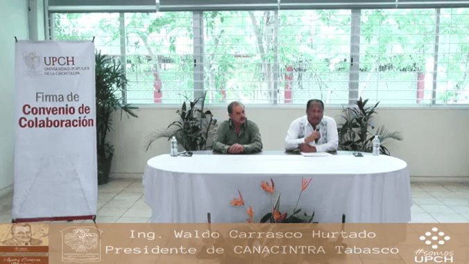 Posterior a la ceremonia, se realizó la transmisión de la firma de convenio de colaboración entre esta casa de estudios superiores y la Cámara Nacional de la Industria de la Transformación (Canacintra), delegación Tabasco, representada por su presidente Waldo Carrasco Hurtado.
