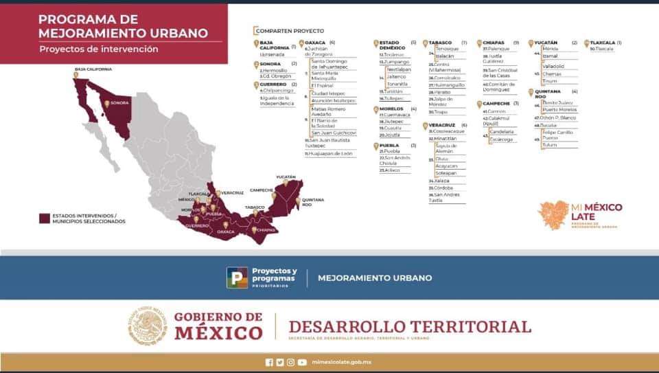 Los 68 municipios que serán beneficiados con el desarrollo de 50 proyectos estratégicos son: Ensenada, Baja California; Hermosillo y Cajeme (Ciudad Obregón), Sonora; Chilpancingo e Iguala, Guerrero; Juchitán de Zaragoza, Santo Domingo Tehuantepec, Santa María Mixtequilla, El Espinal, Ciudad Ixtepec, Asunción Ixtaltepec, Matías Romero, El Barrio de la Soledad, San Juan Guichicovi, San Juan Bautista Tuxtepec y Huajuapan de León, en Oaxaca; Tecámac, Zumpango, Nextlalpan, Jaltenco, Tonanitla, Tultitlan y Tultepec, Estado de México; Cuernavaca, Jiutepec, Cuautla y Jojutla, Morelos; Puebla, San Andrés Cholula y Atlixco, Puebla; Tenosique, Balancán, Centro (Villahermosa), Comalcalco, Huimanguillo, Paraíso, Jalpa de Méndez y Teapa, Tabasco; Cosoleacaque, Minatitlán, Sayula de Alemán, Oluta, Acayucan, Soteapan, Xalapa, Córdoba y San Andrés Tuxtla, en Veracruz; Palenque, Tuxlta Gutiérrez, San Cristobal de las Casas y Comitán de Domínguez, Chiapas; Carmen, Calakmul (Xpujil), Candelaria y Escárcega, Campeche; Mérida, Izamal, Valladolid, Chemax y Tinum, Yucatán; Benito Juárez, Puerto Morelos, Othón P. Blanco, Bacalar, Felipe Carrillo Puerto y Tulúm, Quintana Roo; así como la ciudad de Tlaxcala, Tlaxcala.