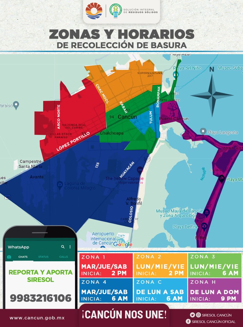 PODER Y CRÍTICA | REDACCIÓN | Para cuidado de la salud pública de los cancunenses, conservar la imagen urbana y prevenir focos de infección de enfermedades, el Ayuntamiento de Benito Juárez, a través del organismo descentralizado Solución Integral de Residuos Sólidos (Siresol), informa los horarios y cobertura de las rutas de recolección de residuos sólidos en la ciudad y Zona Hotelera para que los ciudadanos la depositen adecuadamente.
