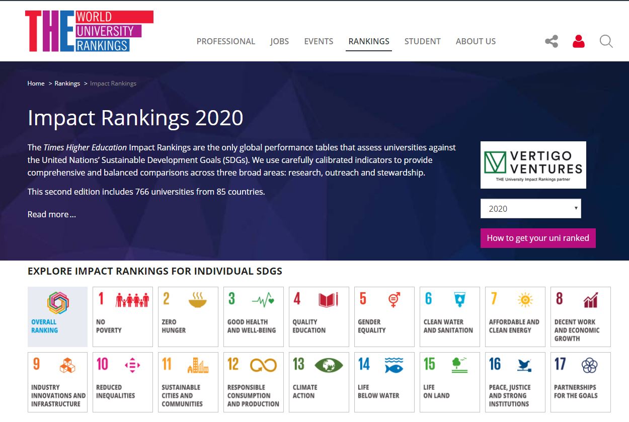 El Ranking Times Higher Education es la única tabla de desempeño global que evalúa a las universidades con respecto a los Objetivos de Desarrollo Sostenible (ODS) de las Naciones Unidas. Utiliza indicadores cuidadosamente calibrados para proporcionar comparaciones integrales y equilibradas en tres áreas amplias: investigación, divulgación y administración.