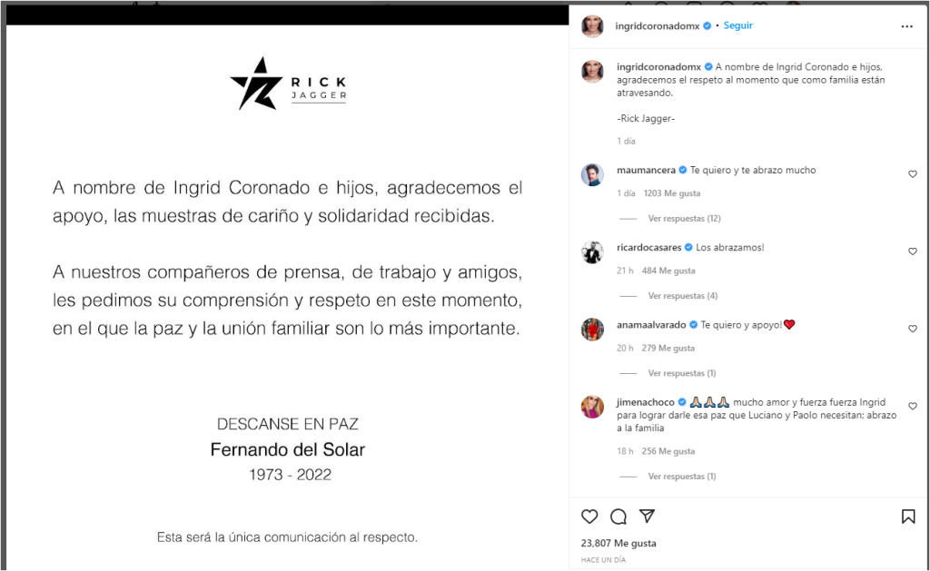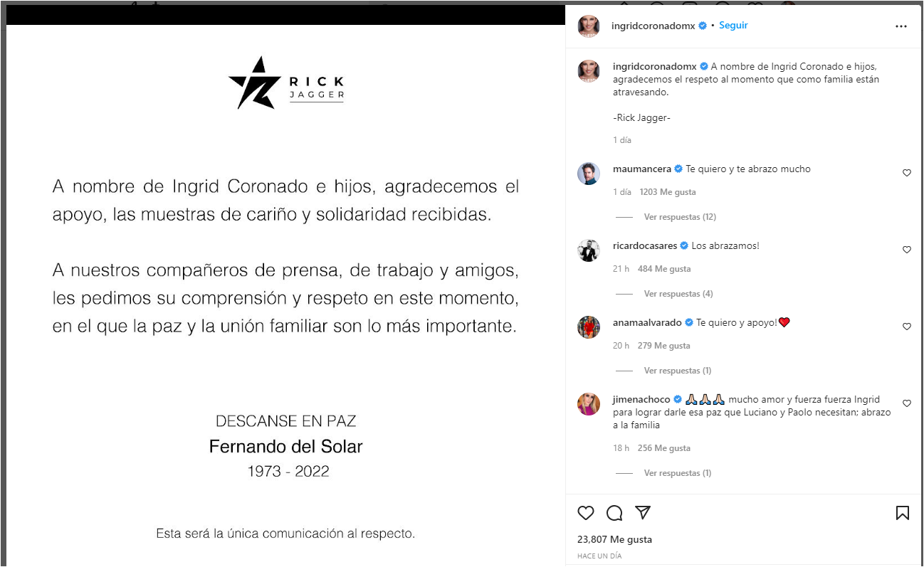 «A nombre de Ingrid Coronado e hijos agradecemos el respeto que como familia están atravesando», decía la publicación a nombre de la agencia Rick Jagger.