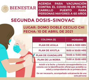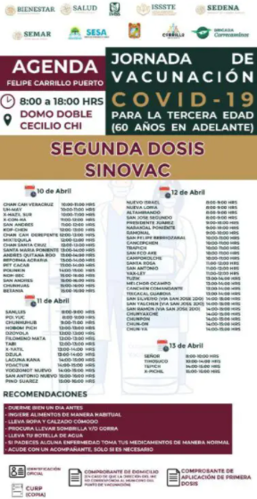 Felipe Carrillo Puerto, Q. Roo, Viernes 09 de Abril de 2021, poderycrítica.- Autoridades municipales y de la Secretaría de Salud de Felipe Carrillo Puerto, dieron a conocer mediante una rueda de prensa la logística que se implementará hoy viernes, la aplicación de la segunda dosis de la vacuna contra el coronavirus a adultos mayores.