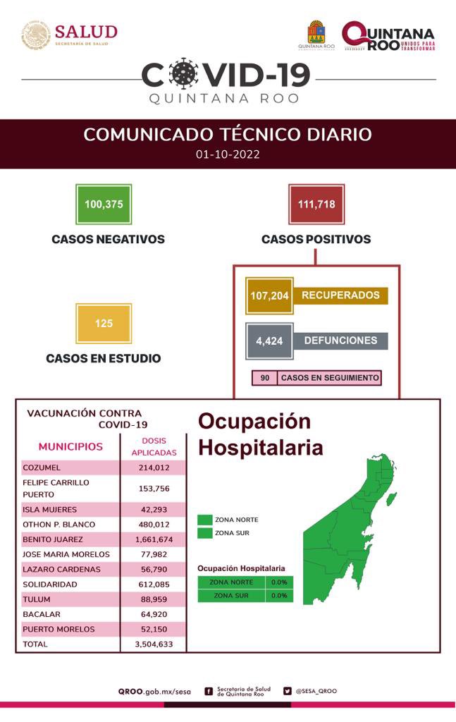 El Comunicado Técnico Diario que elabora el gobierno estatal, indica que hasta el 1 de octubre ya se confirmaron 111, 718 casos positivos de COVID-19 en Quintana Roo, se recuperaron 107, 204 personas y se registran 4,424 defunciones.
