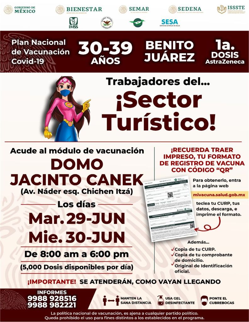 Cancún, Q. Roo, Domingo 27 de Junio de 2021, poderycrítica.- Éste martes 29 de junio iniciará en el municipio de Benito Juárez la vacunación contra la covid-19 para quienes trabajan en la industria turística de Quintana Roo.