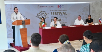 En representación del gobernador Carlos Manuel Merino Campos, el secretario de Gobierno, Guillermo Arturo del Rivero León, acompañado de la embajadora de la República de Chile en México, Beatriz Sánchez Muñoz, puso en marcha la máxima fiesta tabasqueña de las artes, misma que se prolongará hasta el martes 24 de octubre.