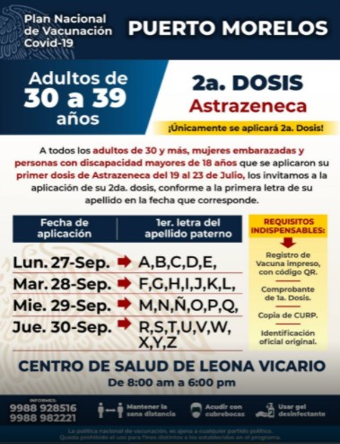 Chetumal, Q. Roo, lunes 27 de septiembre de 2021, poderycrítica.- La mañana de este lunes arrancó una jornada masiva de vacunación en cuatro municipios de Quintana Roo para la aplicación de segundas dosis de AstraZeneca contra el COVID-19.