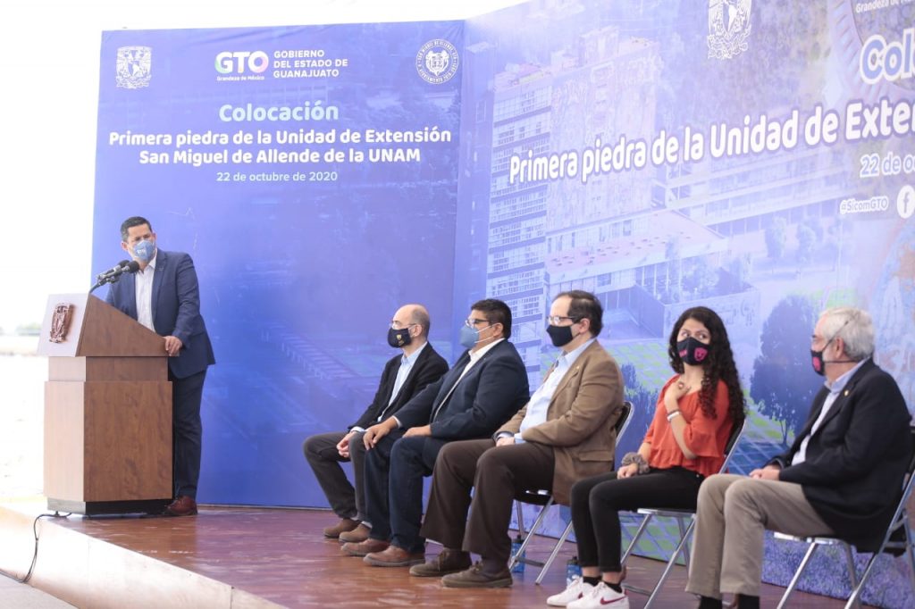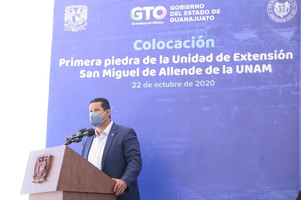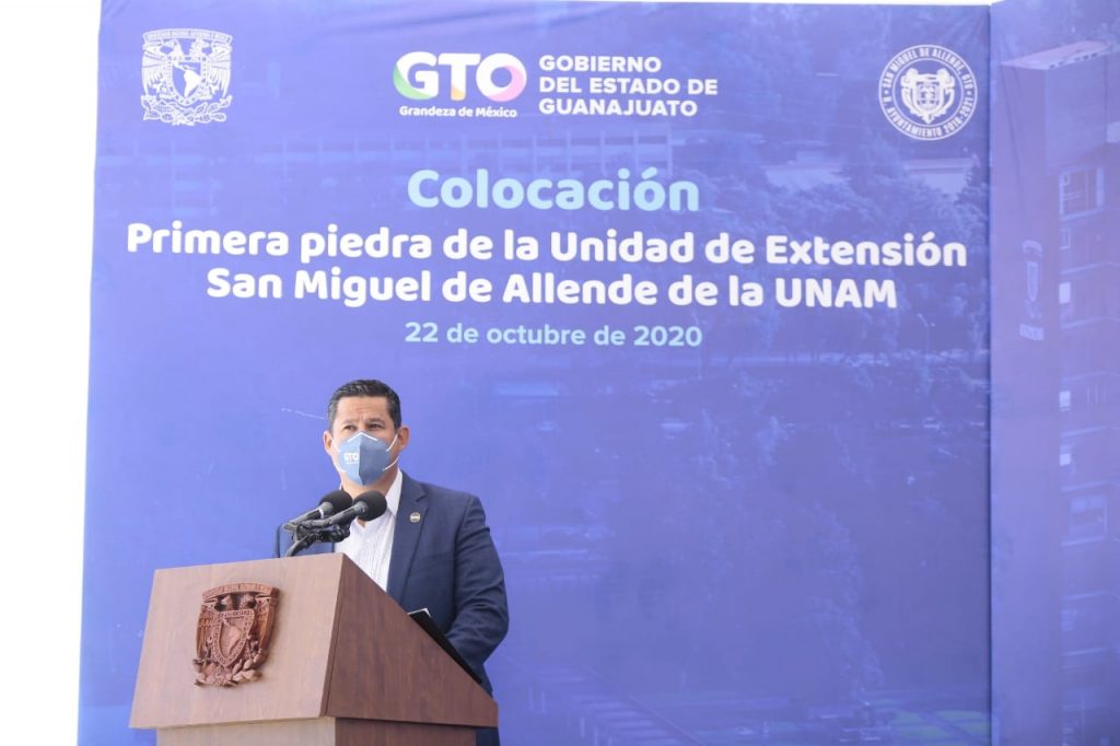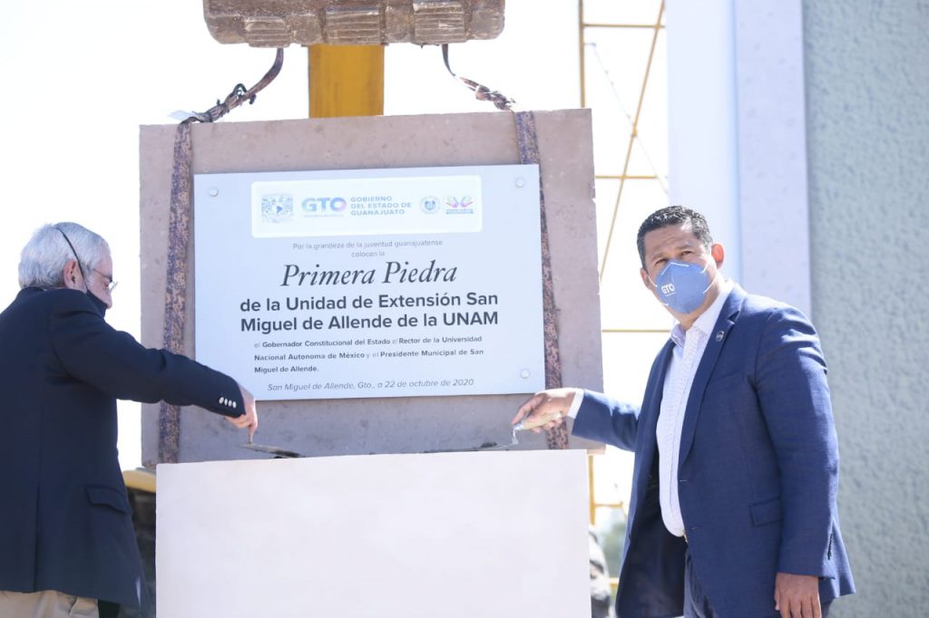 San Miguel de Allende; Gto. , Jueves 22 de Octubre de 2020, poderycrítica.- Guanajuato, con la colocación de la primera piedra de la construcción del plan maestro de la Unidad de Extensión de la Universidad Nacional Autónoma de México -UNAM- en San Miguel Allende, le da buenas noticias a México, dijo el Gobernador, Diego Sinhue Rodríguez Vallejo.