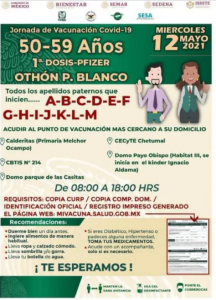 Chetumal, Q. Roo, Martes 11 de Mayo de 2021, poderycrítica.- Inicia mañana aplicación de vacunas covid-19 a quincuagenarios en Chetumal, con la vacunación a este sector de la población en la capital del estado, sólo Benito Juárez quedaría pendiente.