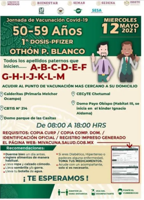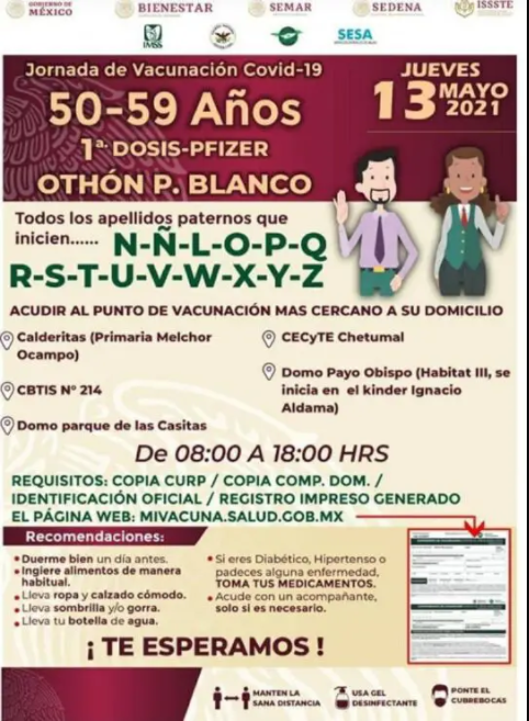 Othón P. Blanco, es el siguiente municipio donde las personas de 50 a 59 años de edad podrán vacunarse contra el covid-19, y es que mañana miércoles 12 de mayo y el jueves 13, de aplicarán las primeras dosis de Pfizer, a las personas en este rango de edad.