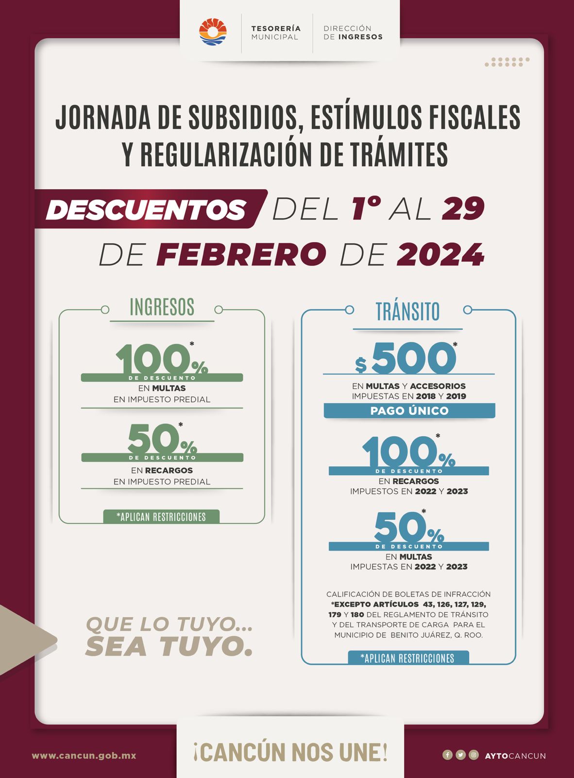 El mecanismo para hacerlo válido es acudir a cualquiera de los 18 módulos para estados de cuenta y pagos en diferentes puntos de la ciudad entre: oficinas municipales, plazas comerciales y otros lugares de fácil acceso, así como en línea a través de la página oficial del Ayuntamiento que es: www.cancun.gob.mx.