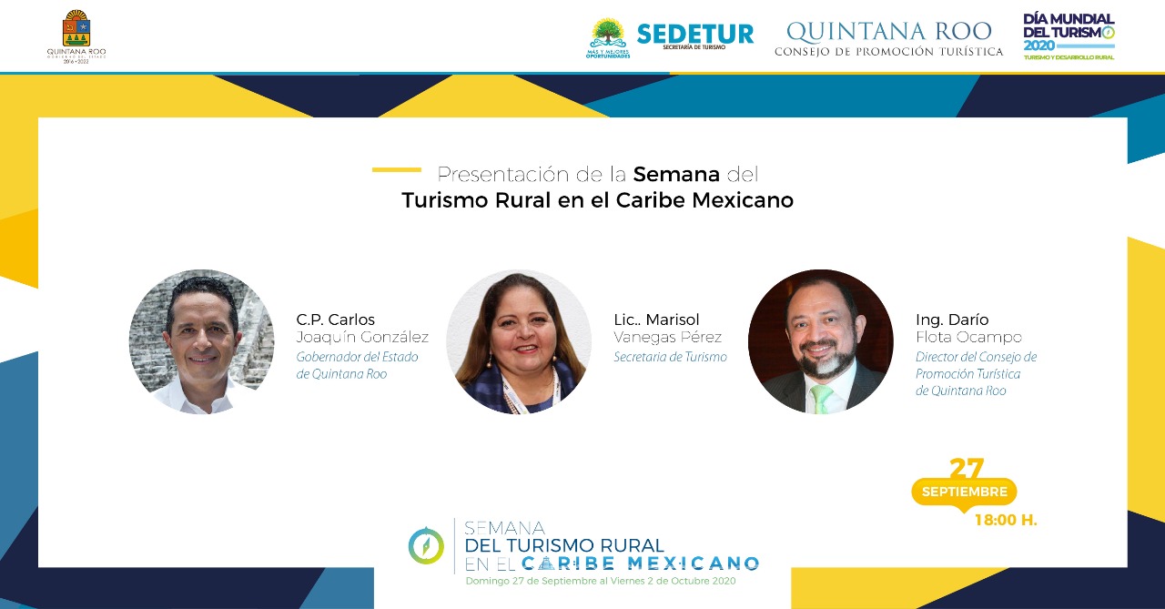 Cancún, Q. Roo, Lunes 28 de septiembre de 2020, poderycrítica.- En el marco de la Semana del Turismo Rural en el Caribe Mexicano, en conmemoración del Día Mundial del Turismo 2020, el día de ayer, 27 de septiembre, contamos con la participación del Gobernador Constitucional de Quintana Roo, Carlos Joaquín González, la Secretaria de Turismo Estatal, Marisol Vanegas Pérez y el Director General del CPTQ, Darío Flota Ocampo quienes, en la inauguración de este importante programa, hablaron de la importancia del turismo y de las diferentes actividades que integran el turismo rural en Quintana Roo; recalcando que en nuestro estado contamos con una amplia diversidad turística que abarca más que sol y playa, para ofrecer a nuestros visitantes.