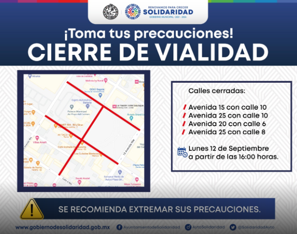 Al respecto de estos cierres, el ayuntamiento de Solidaridad, a través de un flyer informativo, recomendó a los automovilistas tomar las vías alternas, en caso de intentar dirigirse hacia la avenida 30, desde esta zona.